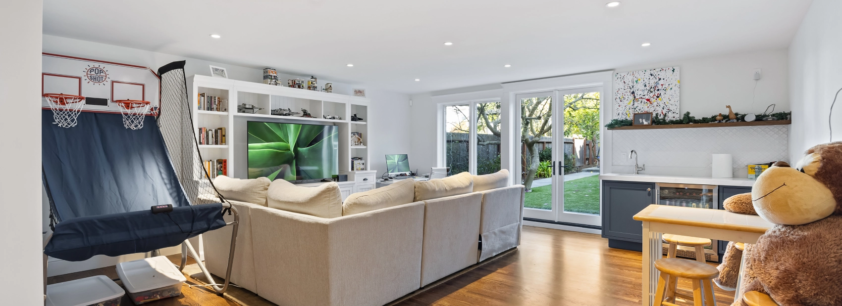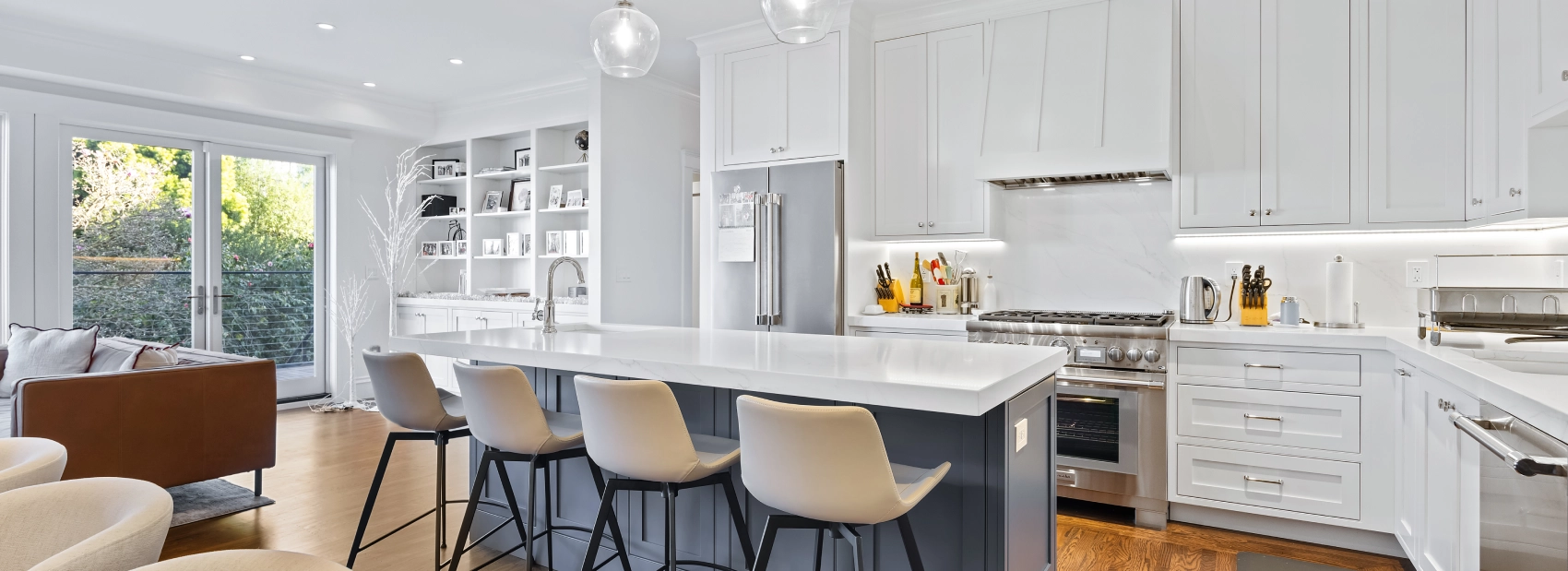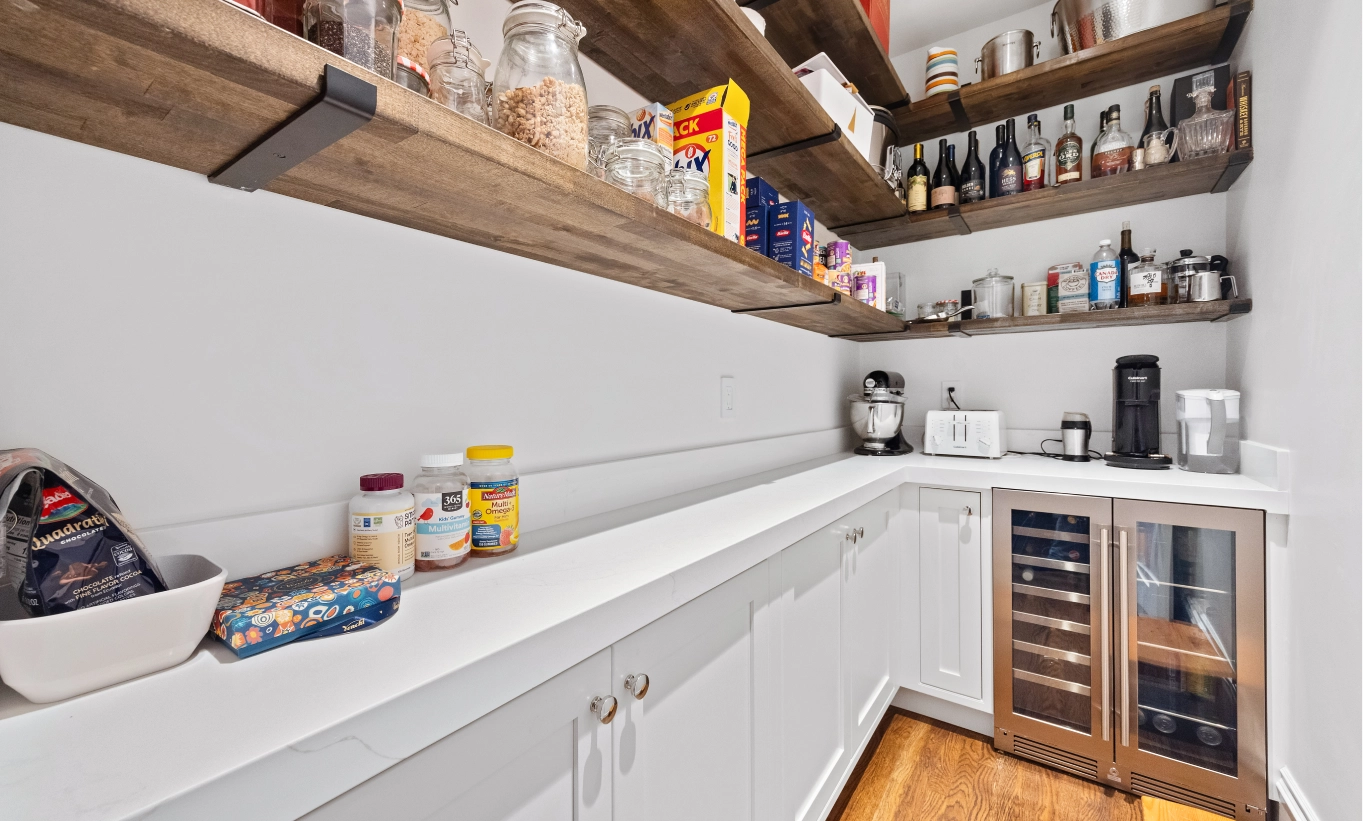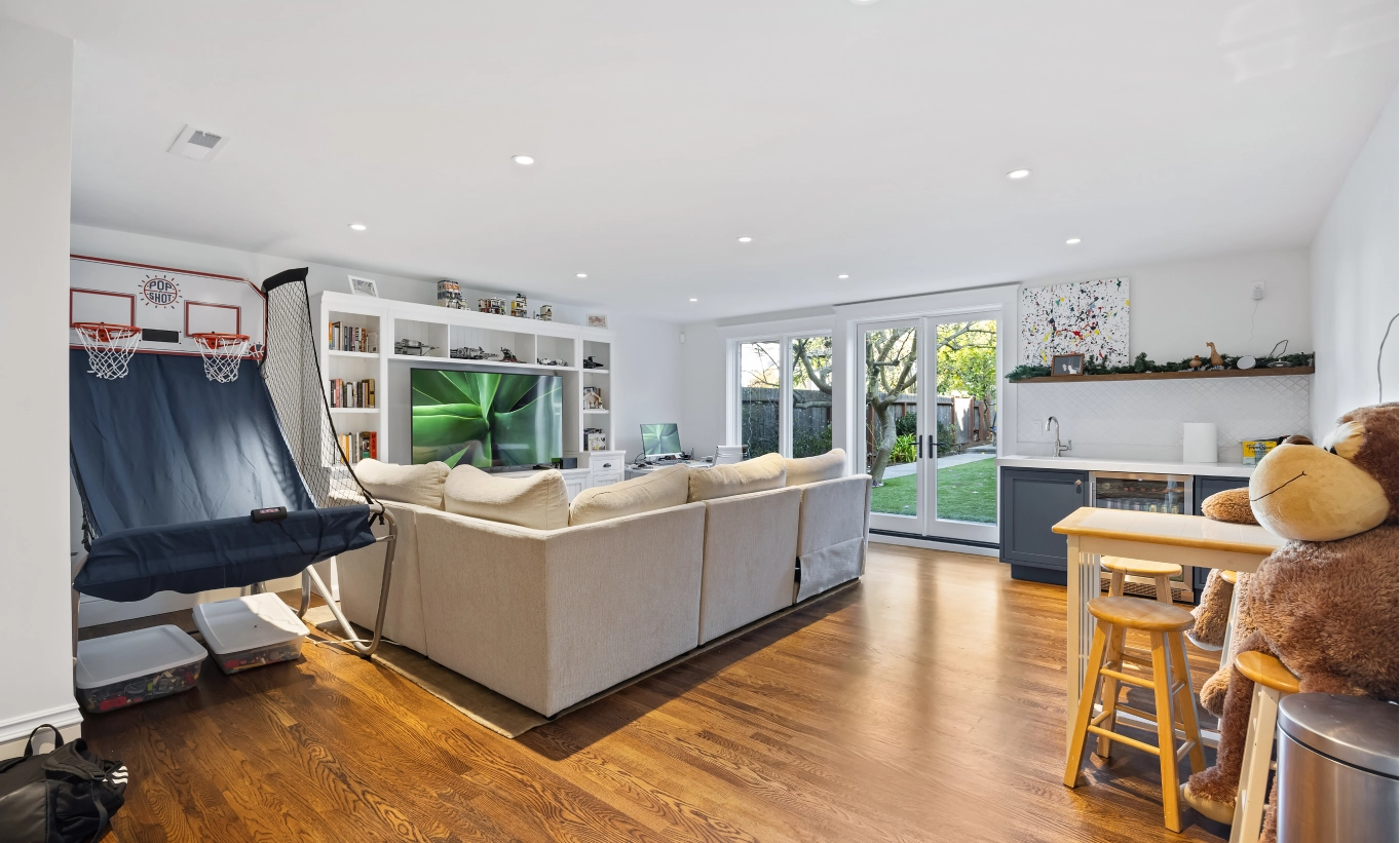 This full house remodel on 20th Ave by Mission Home Remodeling is a testament to modern elegance and thoughtful craftsmanship. The kitchen is a showpiece with crisp white shaker-style cabinetry, a bold navy island topped with gleaming quartz, and stylish pendant lights that add a touch of luxury. Stainless steel appliances and a seamless flow to the adjacent living area create a perfect balance of functionality and aesthetic appeal. Warm hardwood floors stretch throughout the home, tying each space together with natural charm.